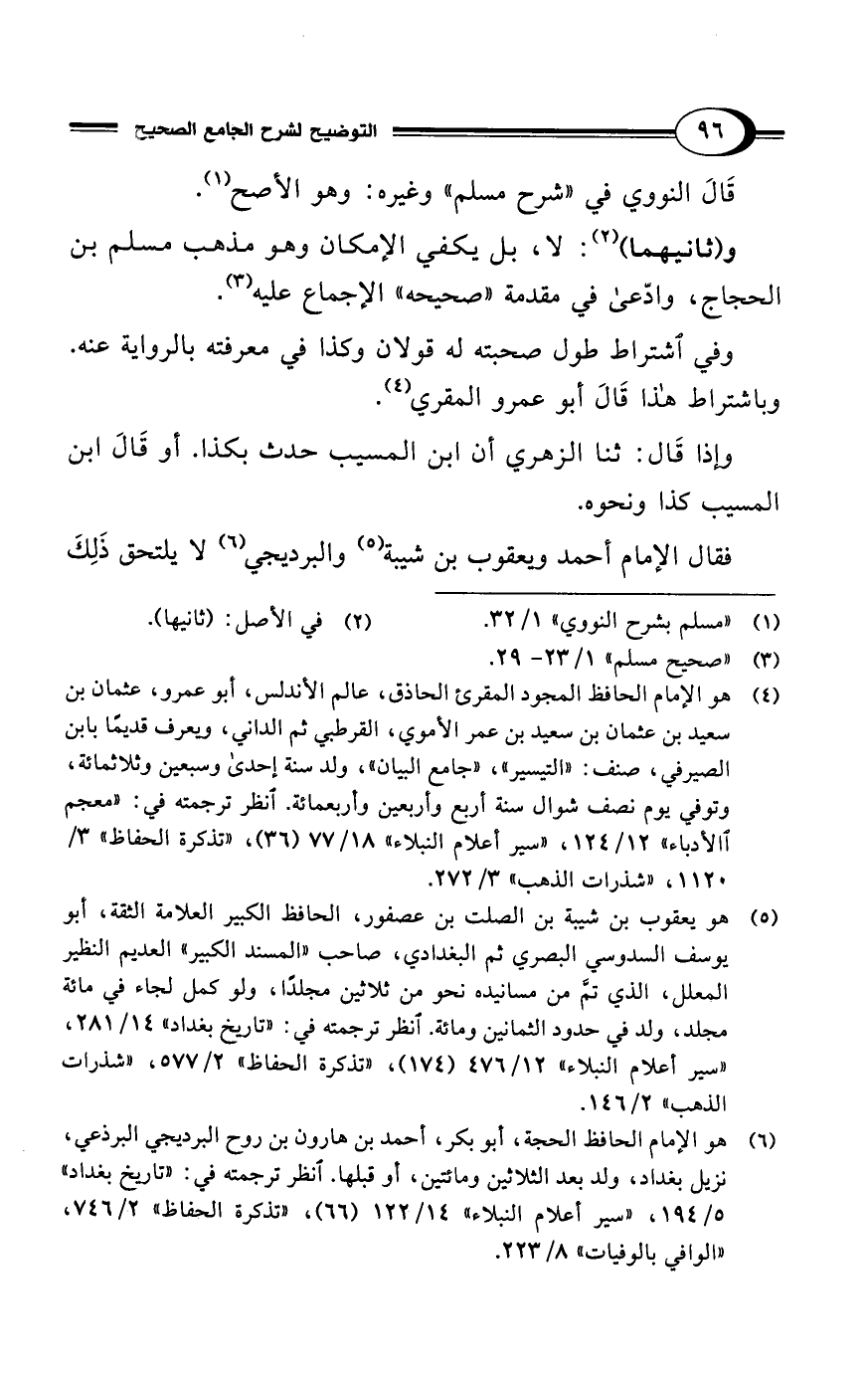 و (ثانيهما) (¬2): لا، بل يكفي الإمكان وهو مذهب مسلم بن الحجاج، وادّعى في مقدمة "صحيحه" الإجماع عليه (¬3).
