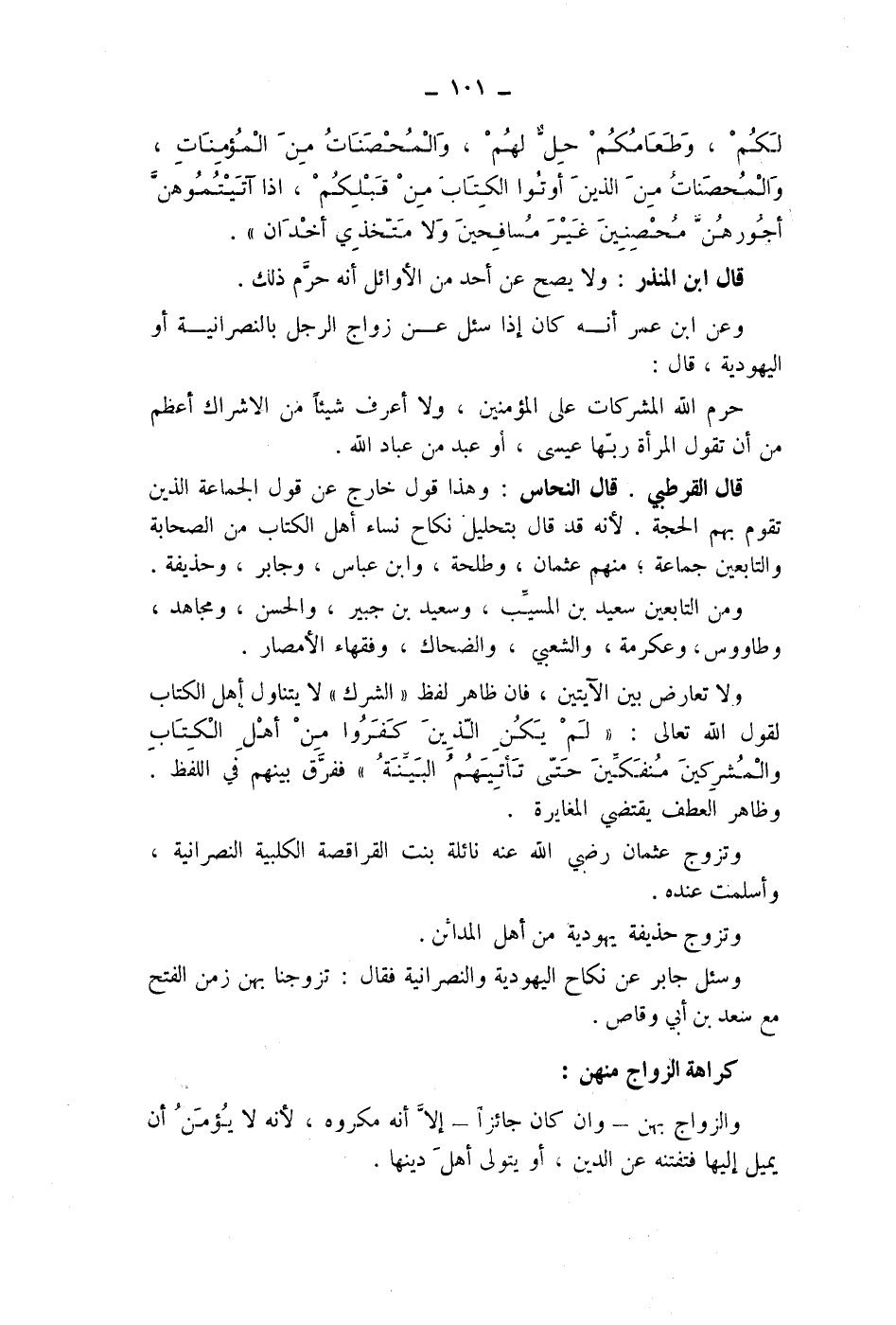 لانه قد قال بتحليل نكاح نساء أهل الكتاب من الصحابة والتابعين جماعة، منهم عثمان، وطلحة، وابن عباس، وجابر، وحذيفة.