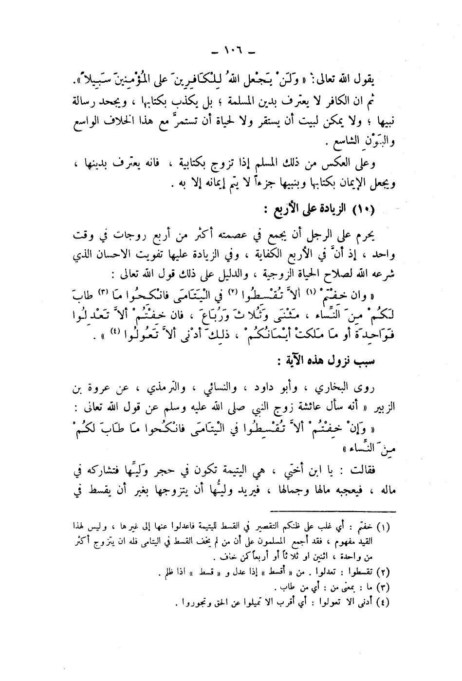 (10) الزيادة على الاربع: يحرم على الرجل أن يجمع في عصمته أكثر من أربع روجات في وقت واحد، إذ أن في الاربع الكفاية، وفي الزيادة عليها تفويت الاحسان الذي شرعه الله لصلاح الحياة الزوجية، والدليل على ذلك قول الله تعالى: " وان خفتم (1) ألا تقسطوا (2) في اليتامى فانكحوا ما (3) طاب لكم من النساء، مثنى وثلاث ورباع، فان خفتم ألا تعدلوا فواحدة أو ما ملكت أيمانكم، ذلك أدنى ألا تعولوا (4) ".