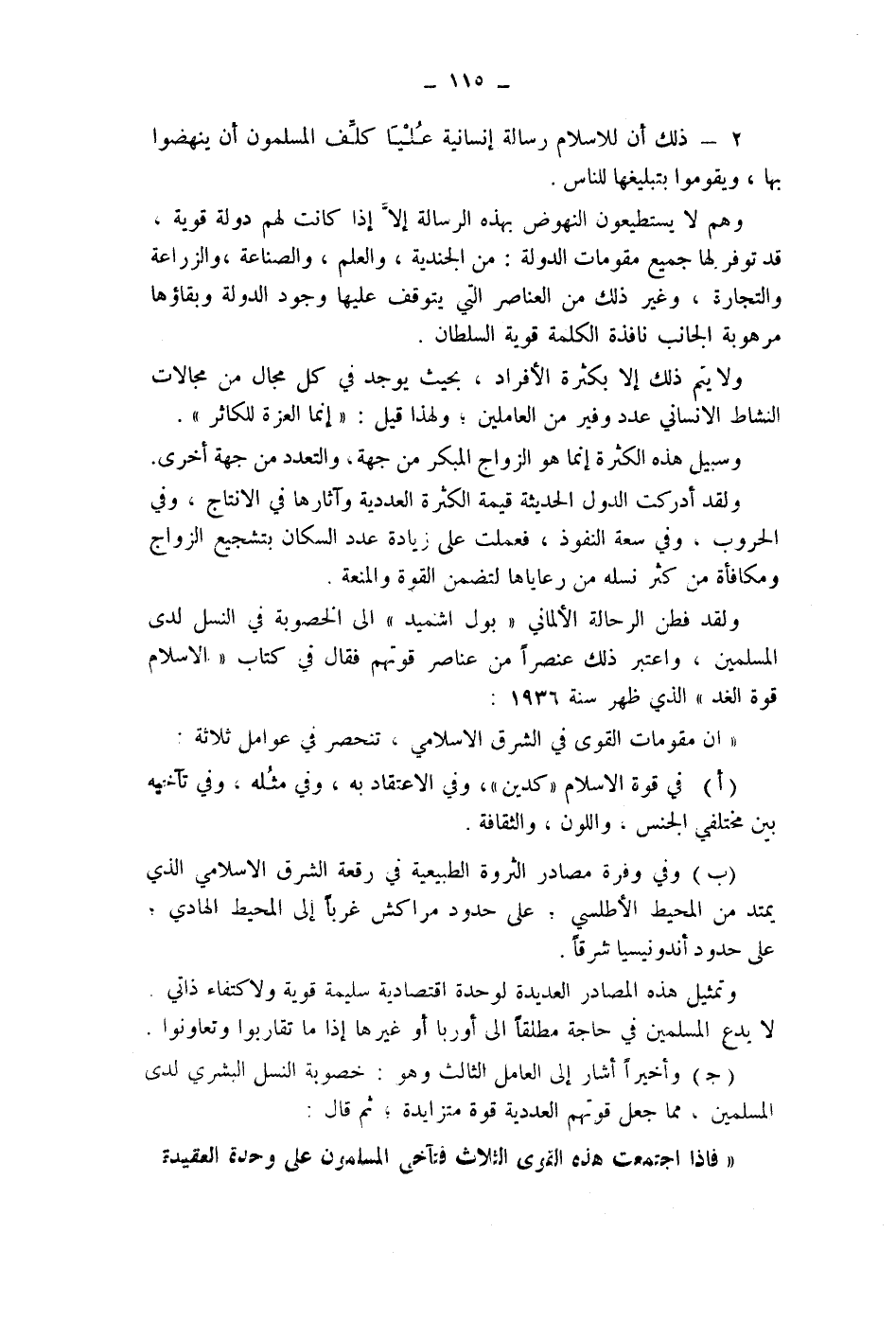 (ج) وأخيرا أشار إلى العامل الثالث وهو: خصوبة النسل البشري لدى المسلمين، مما جعل قوتهم العددية قوة متزايدة، ثم قال: " فإذا اجتمعت هذه القوى الثلاث فتأخى المسلمون على وحدة العقيدة