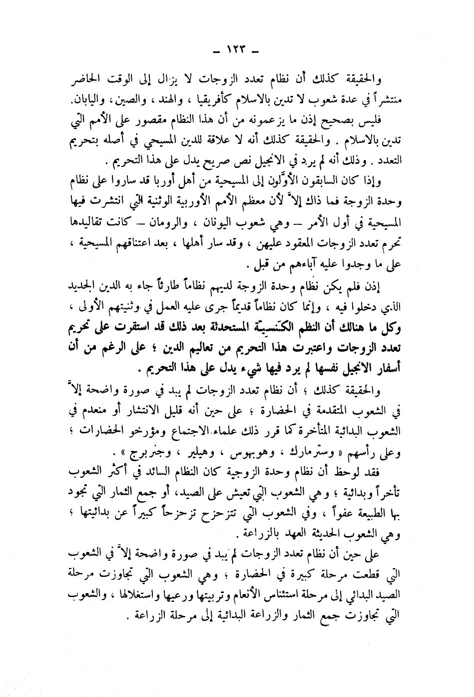 والحقيقة كذلك، أن نظام تعدد الزوجات لم يبد في صورة واضحة إلا في الشعوب المتقدمة في الحضارة، على حين أنه قليل الانتشار أو منعدم في الشعوب البدائية المتأخرة كما قرر ذلك علماء الاجتماع ومؤرخو الحضارات، وعلى رأسهم " وستر مارك، وهو بهوس، وهيلير، وجنربرج ".