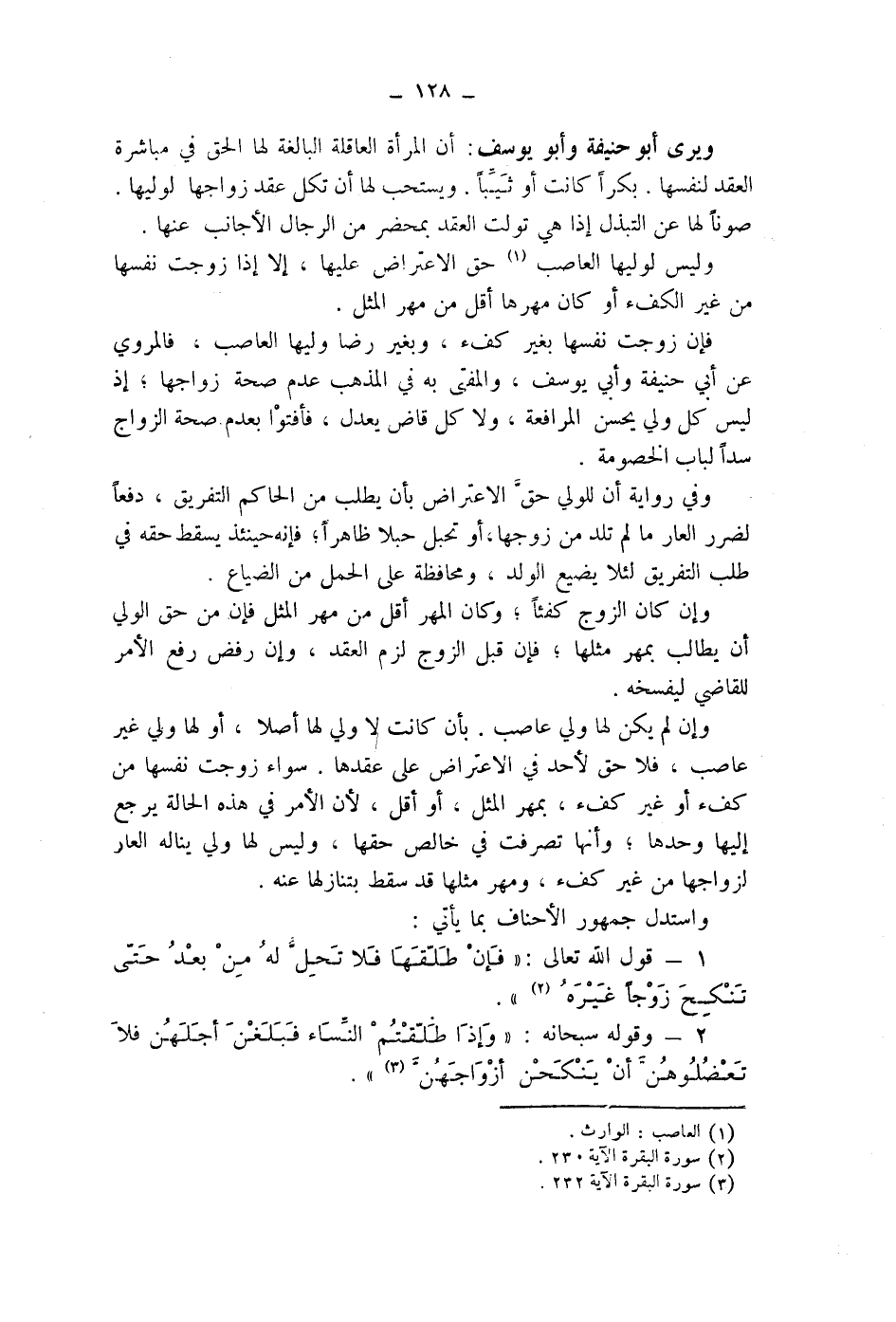 ويرى أبو حنيفة وأبو يوسف: أن المرأة العاقلة البالغة لها الحق في مباشرة العقد لنفسها.