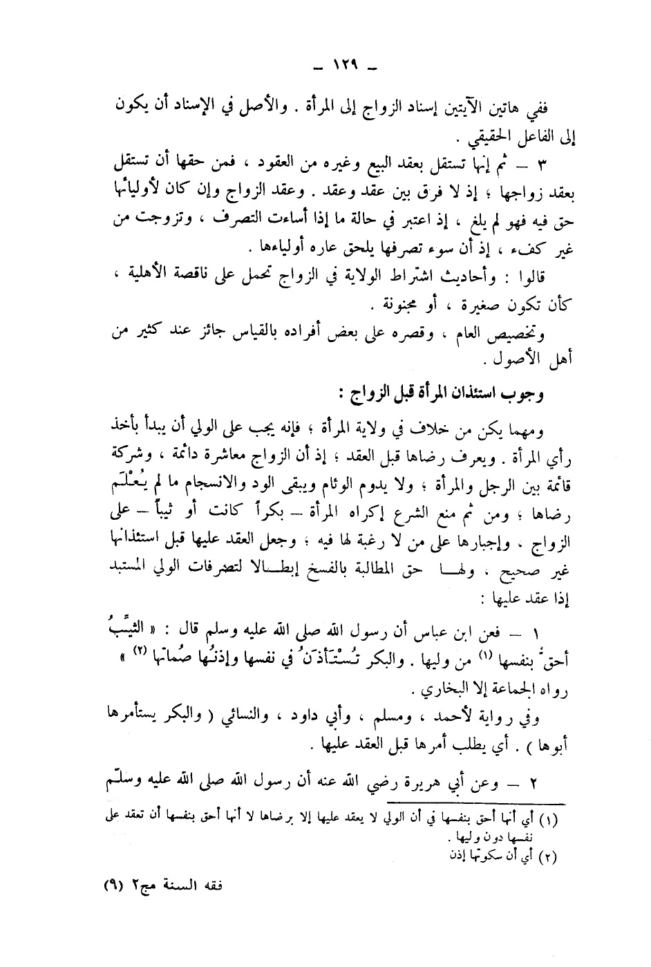 1 - فعن ابن عباس أن رسول الله صلى الله عليه وسلم قال: " الثيب أحق بنفسها (1) من وليها. والبكر تستأذن في نفسها وإذنها صماتها (2) " رواه الجماعة إلا البخاري.