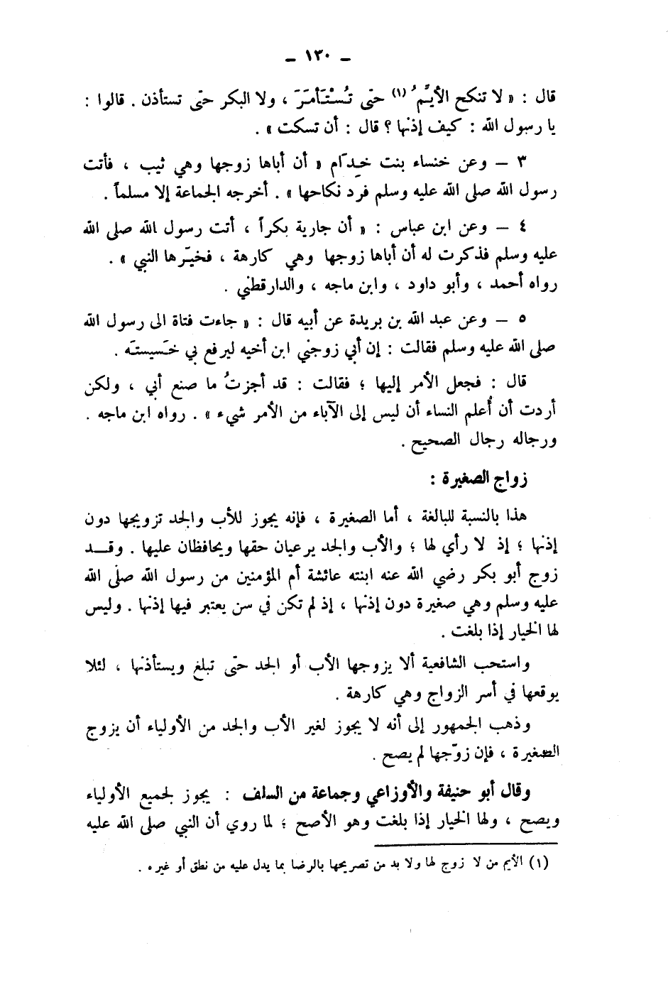 هذا بالنسبة للبالغة، أما الصغيرة، فإنه يجوز للاب والجد تزويجها دون إذنها، إذ لا رأي لها، والاب والجد يرعيان حقها ويحافظان عليها.