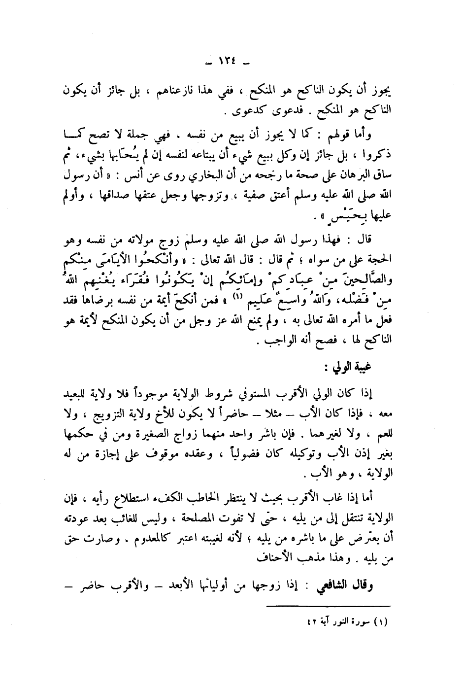 أما إذا غاب الاقرب بحيث لا ينتظر الخاطب الكفء استطلاع رأيه، فإن الولاية تنتقل إلى من يليه، حتى لا تفوت المصلحة، وليس للغائب بعد عودته أن يعترض على ما باشره من يليه، لانه لغيبته اعتبر كالمعدوم، وصارت حق من يليه.
