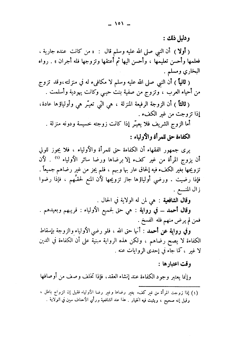(1) إذا زوجت المرأة من غير كفء بغير رضاها وغير رضا الاولياء فقيل إن الزواج باطل، وقيل إنه صحيح، ويثبت فيه الخيار.