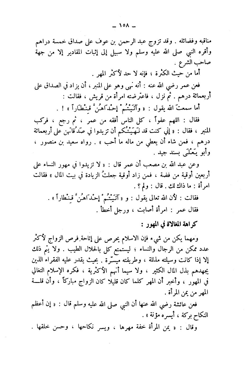 وعن عبد الله بن مصعب أن عمر قال: " لا تزيدوا في مهور النساء على أربعين أوقية من فضة، فمن زاد أوقية جعلت الزيادة في بيت المال " فقالت امرأة: ما ذاك لك.
