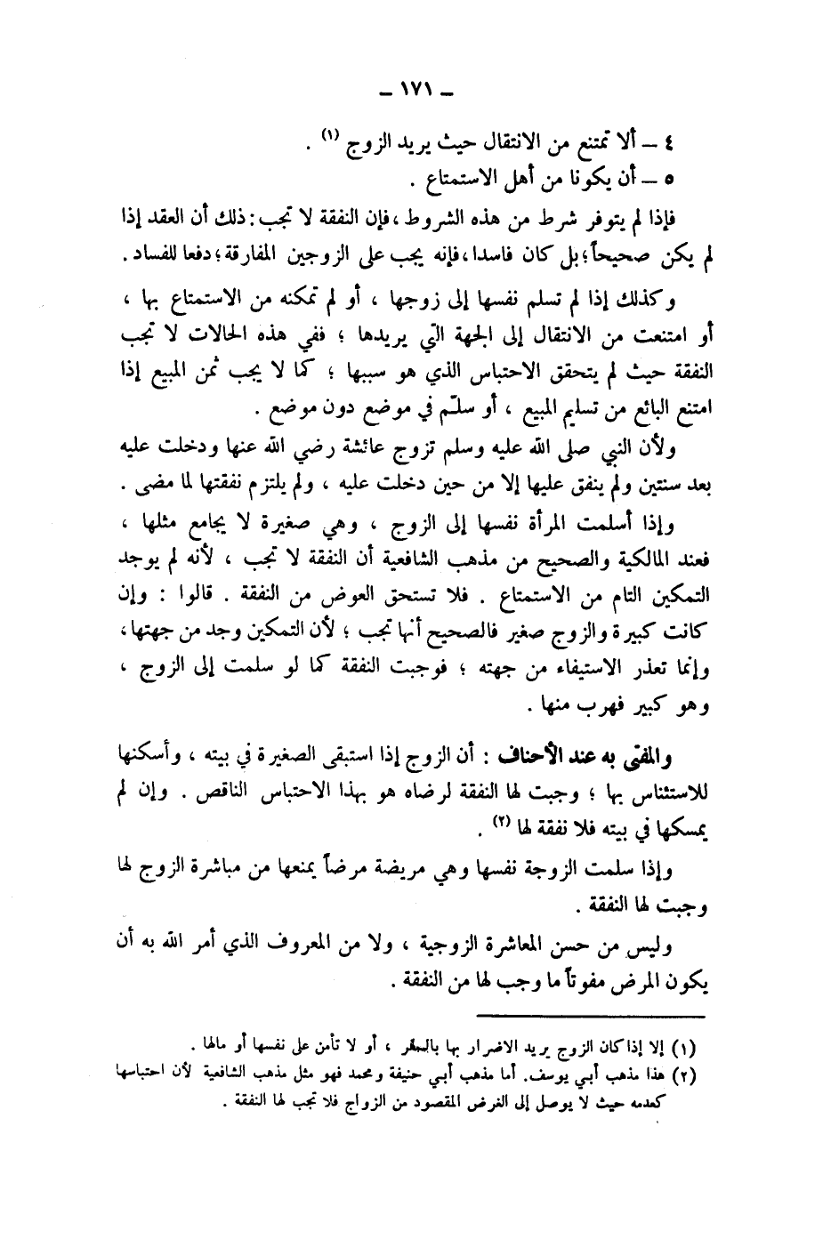 (2) هذا مذهب أبي يوسف، أما مذهب أبي حنيفة ومحمد فهو مثل مذهب الشافعية لان احتباسها كعدمه حيث لا يوصل إلى الغرض المقصود من الزواج فلا تجب لها النفقة