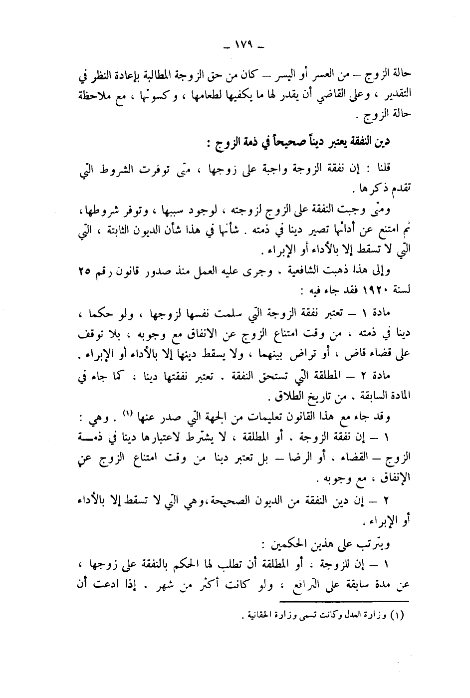 مادة 1 - تعتبر نفقة الزوجة التي سلمت نفسها لزوجها، ولو حكما، دينا في ذمته، من وقت امتناع الزوج عن الانفاق مع وجوبه، بلا توقف على قضاء قاض، أو تراض بينهما، ولا يسقط دينها إلا بالاداء أو الابراء.