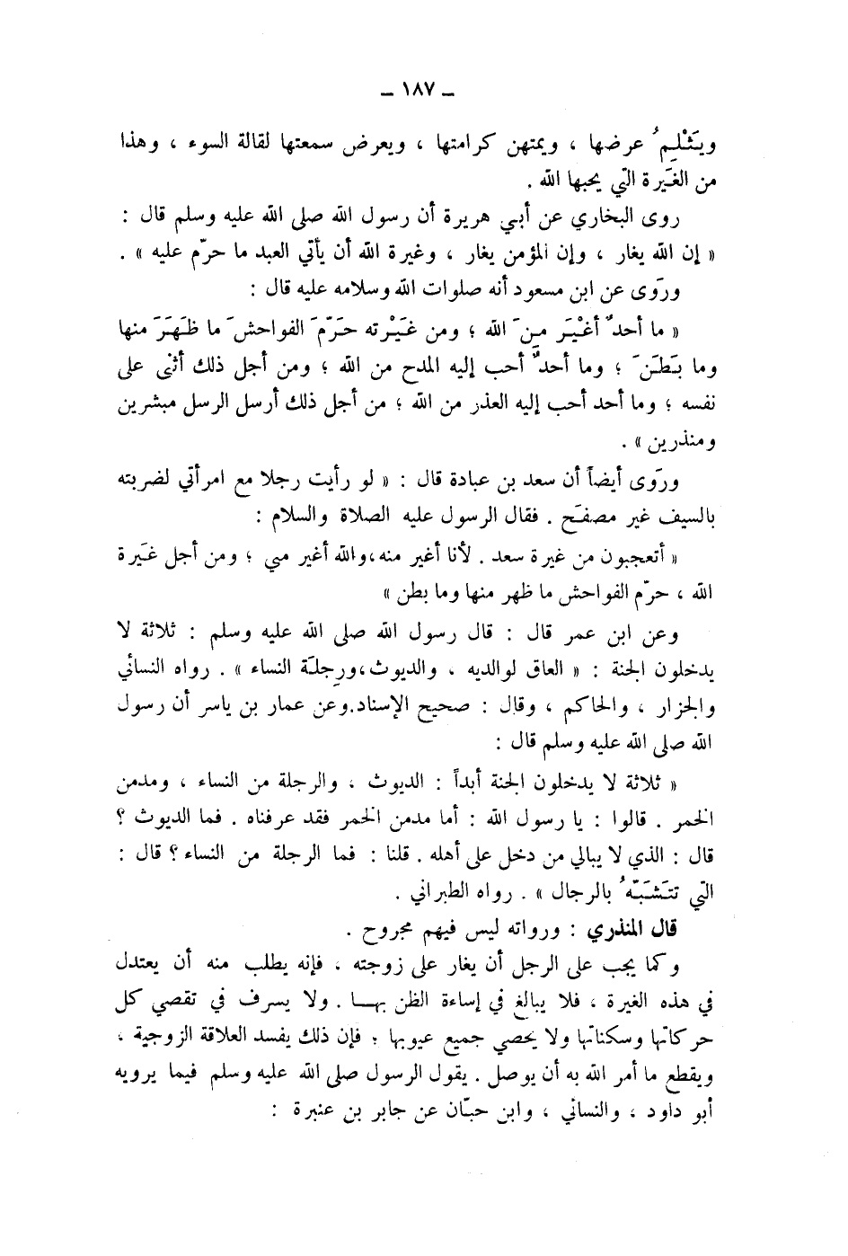 وعن عمار بن ياسر أن رسول الله صلى الله عليه وسلم قال: " ثلاثة لا يدخلون الجنة أبدا: الديوث، والرجلة من النساء، ومدمن الخمر. قالوا: يارسول الله: أما مدمن الخمر فقد عرفناه. فما الديوث؟ قال: الذي لا يبالي من دخل على أهله. قلنا: فما الرجلة من النساء؟ قال: التي تتشبه بالرجال ". رواه الطبراني. قال المنذري: ورواته ليس فيهم مجروح.