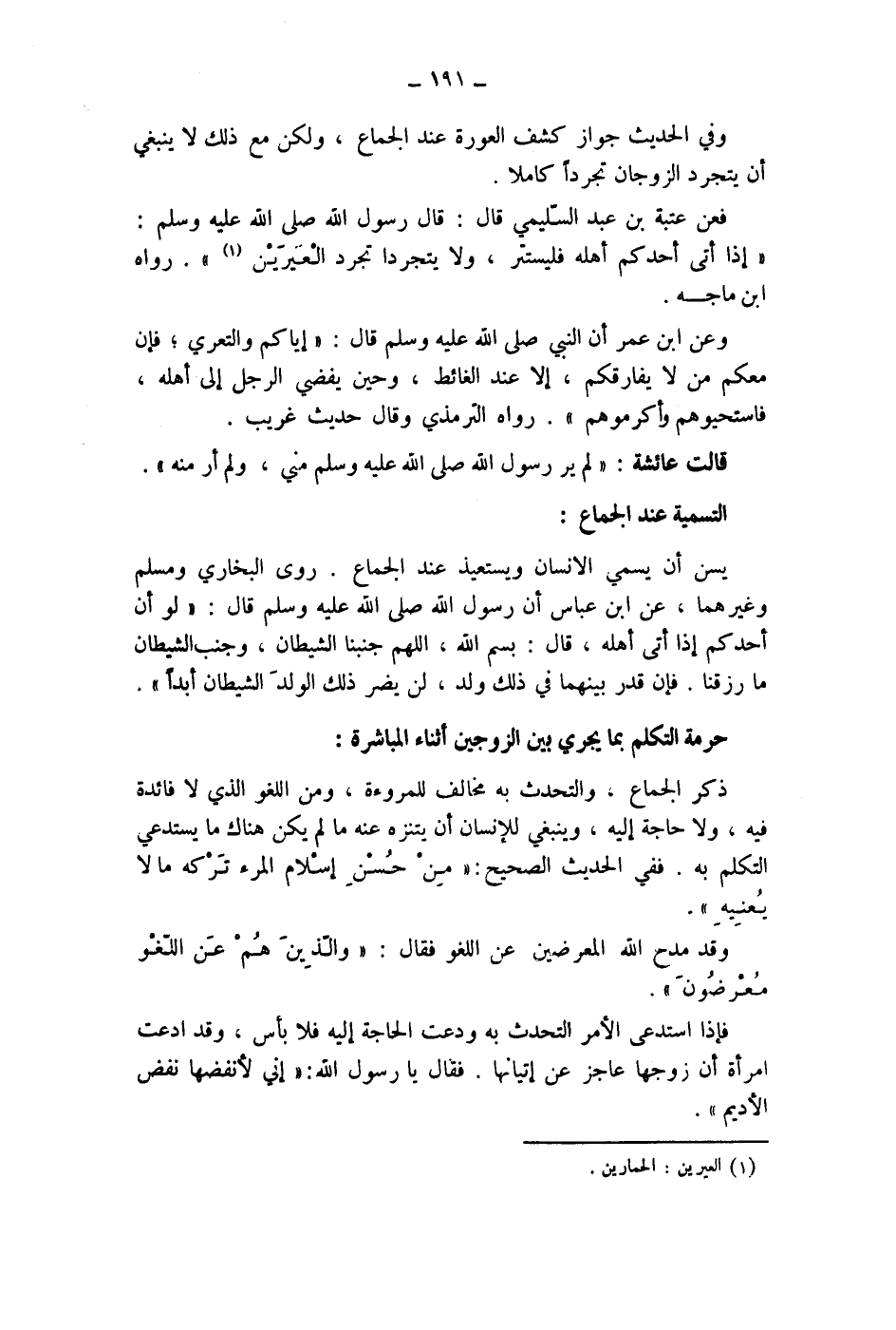 وفي الحديث جواز كشف العورة عند الجماع، ولكن مع ذلك لا ينبغي أن يتجرد الزوجان تجردا كاملا.