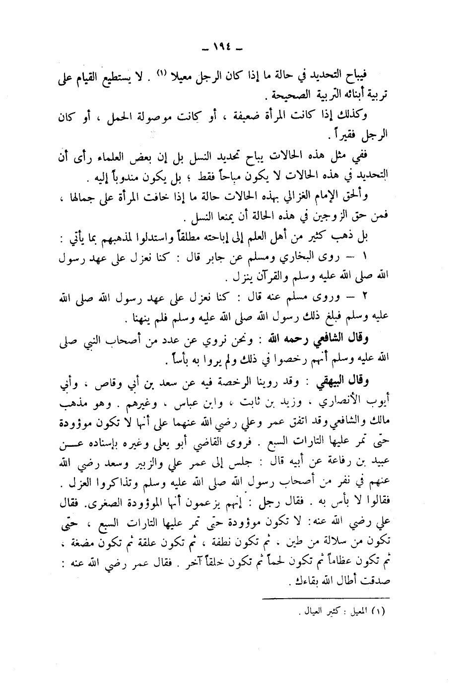 فيباح التحديد في حالة ما إذا كان الرجل معيلا (1) لايستطيع القيام على تربية أبنائه التربية الصحيحة.