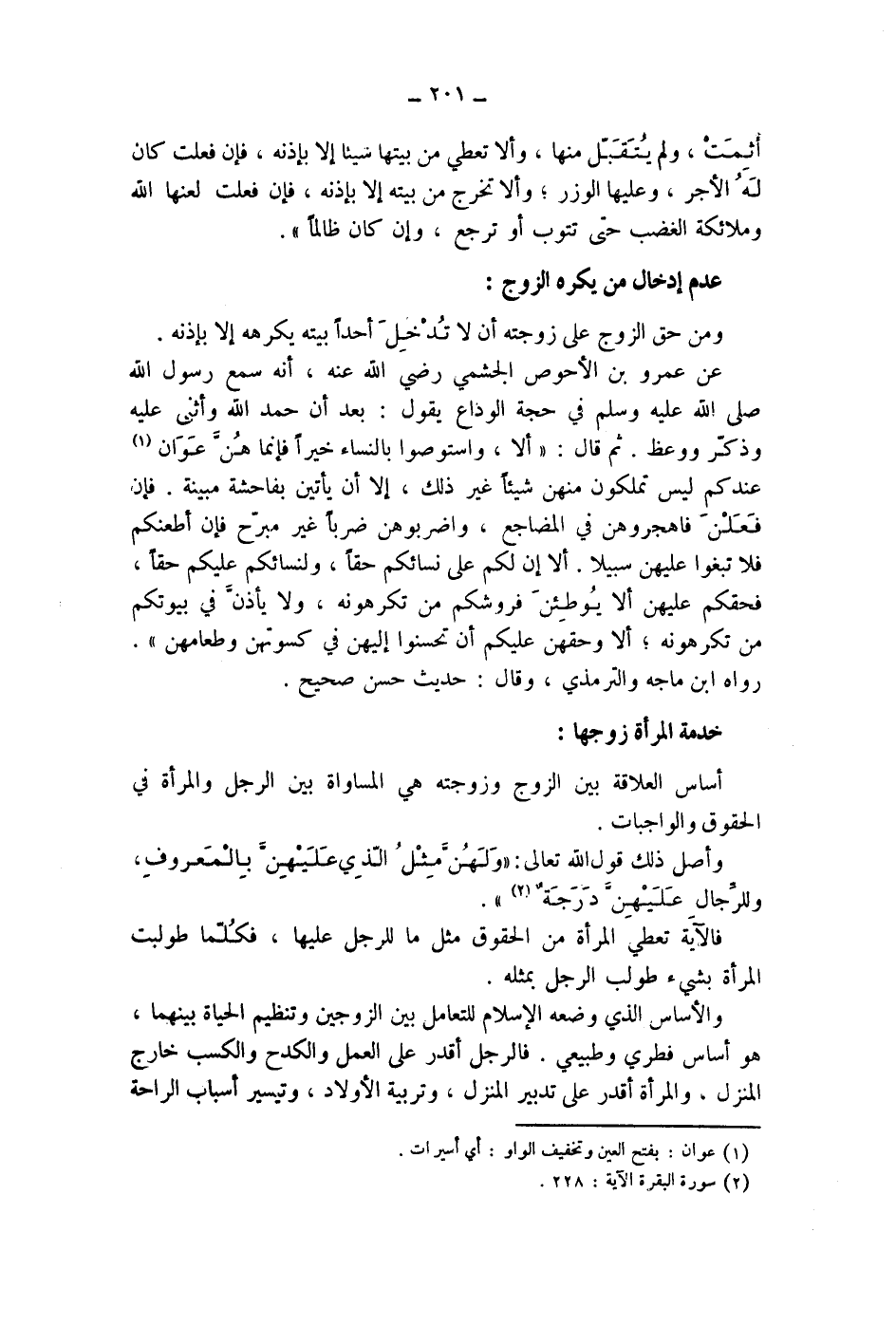 عن عمرو بن الاحوص الجشمي رضي الله عنه، أنه سمع رسول الله صلى الله عليه وسلم في حجة الوداع يقول: بعد أن حمد الله وأثنى عليه وذكر ووعظ. ثم قال: " ألا، واستوصوا بالنساء خيرا فإنما هن عوان (1) عندكم ليس تملكون منهن شيئا غير ذلك، إلا أن يأتين بفاحشة مبينة.
