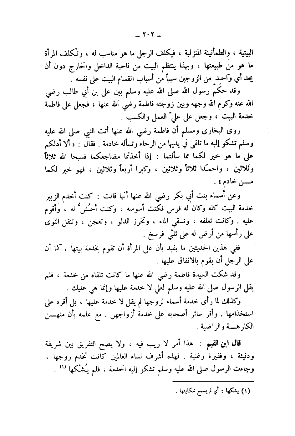 وقد شكت السيدة فاطمة رضي الله عنها ما كانت تلقاه من خدمة، فلم يقل الرسول الله صلى الله عليه وسلم لعلي لا خدمة عليها وإنما هي عليك.