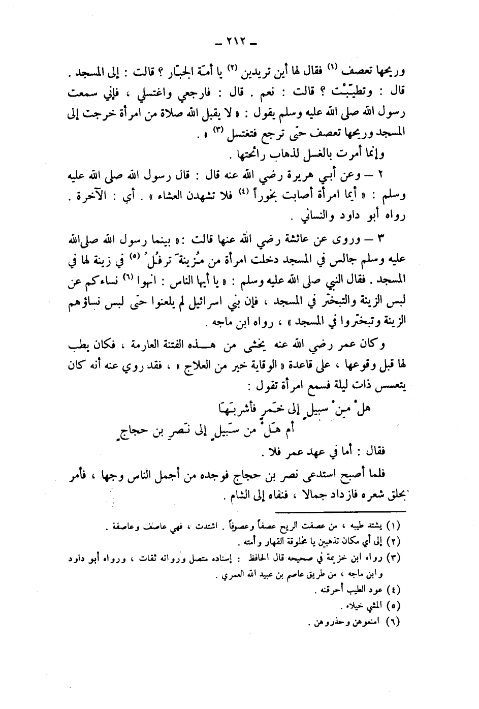 وريحها تعصف (1) فقال لها أين تريدين (2) يا أمة الجبار؟ قالت: إلى المسجد. قال: وتطيبت؟ قالت: نعم. قال: فارجعي واغتسلي، فإني سمعت رسول الله صلى الله عليه وسلم يقول: " لا يقبل الله صلاة من امرأة خرجت إلى المسجد وريحها تعصف حتى ترجع فتغتسل (3) ". وإنما أمرت بالغسل لذهاب رائحتها.