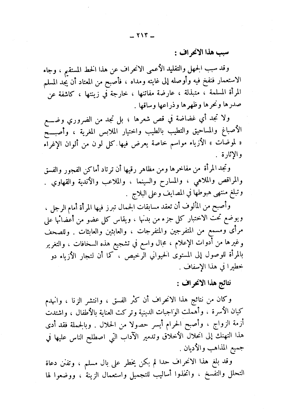 وقد سبب الجهل والتقليد الاعمى الانحراف عن هذا الخط المستقيم، وجاء الاستعمار فنفخ فيه وأوصله إلى غايته ومداه، فأصبح من المعتاد أن يجد المسلم المرأة المسلمة، متبذلة، عارضة مفاتنها، خارجة في زينتها، كاشفة عن صدرها ونحرها وظهرها وذراعها وساقها.
