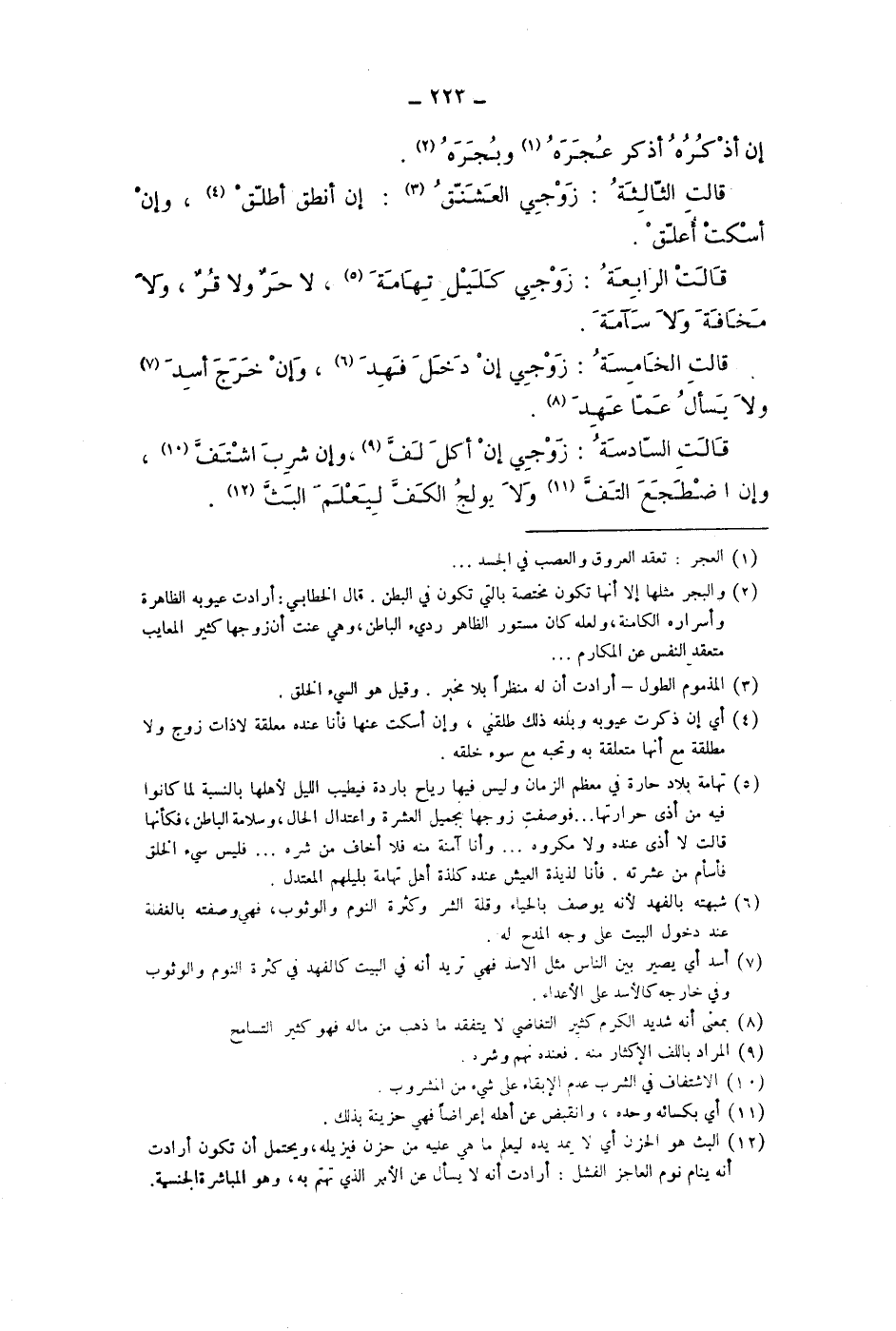 قال الخطابي: أرادت عيوبه الظاهرة وأسراره الكامنة، ولعله كان مستور الظاهر ردئ الباطن، وهي عنت أن زوجها كثير المعايب متعقد النفس عن المكارم ... (3) المذموم الطول - أرادت أن لا منظرا بلا مخبر. وقيل هو السئ الخلق.