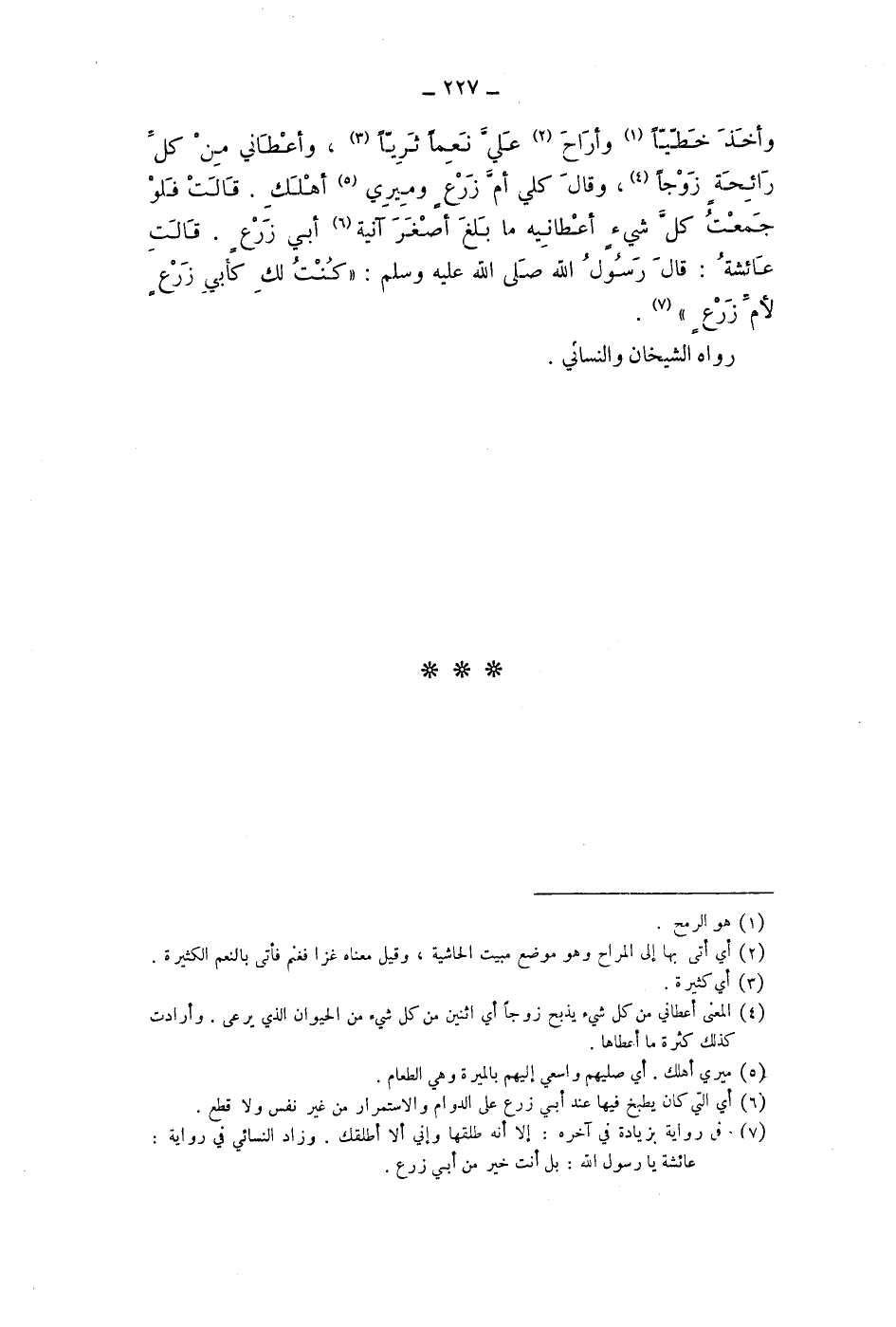 (7) في رواية بزيادة في آخره: إلا أنه طلقها وإني ألا أطلقك. وزاد النسائي في رواية: عائشة يا رسول الله: بل أنت خير من أبي زرع.