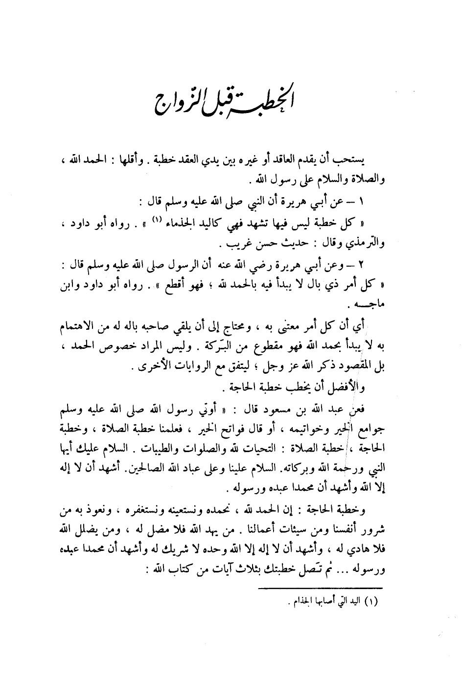 1 - عن أبي هريرة أن النبي صلى الله عليه وسلم قال: " كل خطبة ليس فيها تشهد فهي كاليد الجذماء (1) ".