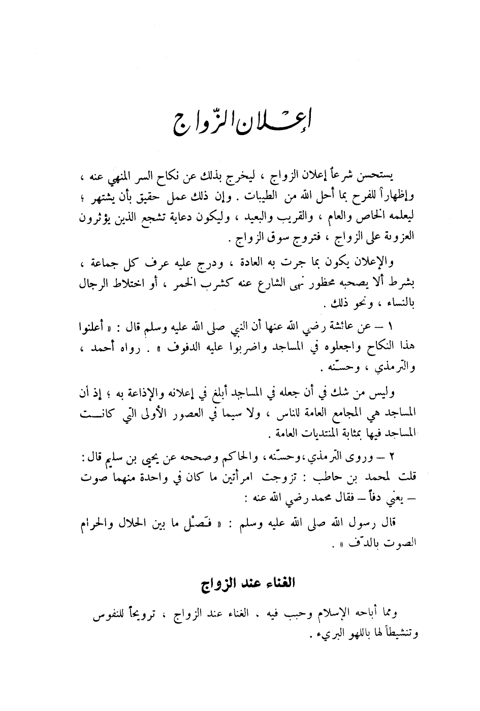 1 - عن عائشة رضي الله عنها أن النبي صلى الله عليه وسلم قال: " أعلنوا هذا النكاح واجعلوه في المساجد واضربوا عليه الدقوف ". رواه أحمد، والترمذي، وحسنه.
