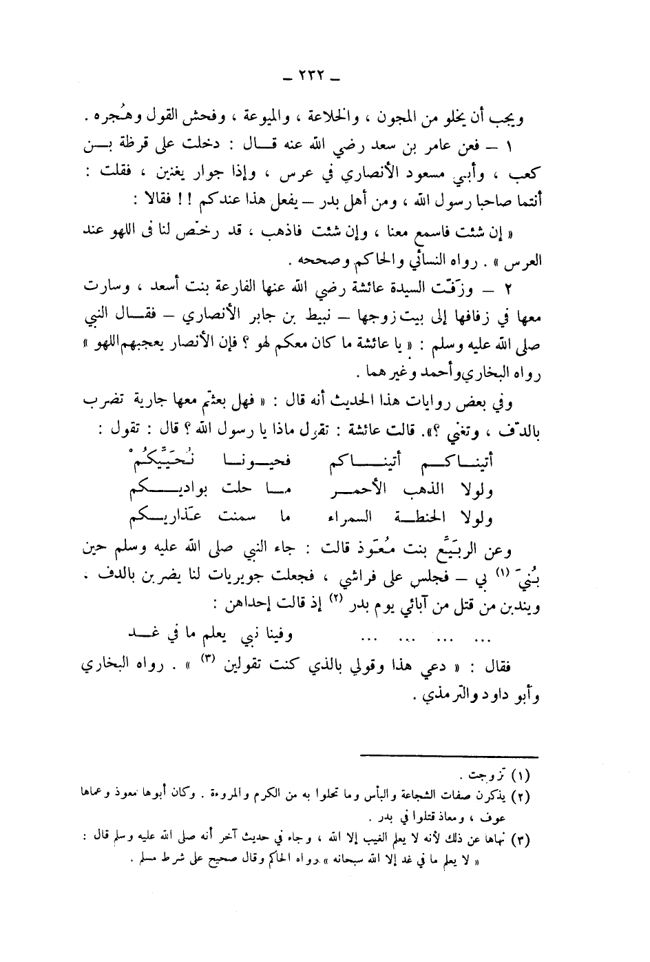 قالت عائشة: تقول ماذا يا رسول الله؟ قال: تقول: أتيناكم أتيناكم - فحيونا نحييكم ولولا الذهب الاحمر - ما حلت بواديكم ولولا الحنطة السمراء - ما سمنت عذاريكم وعن الربيع بنت معوذ قالت: جاء النبي صلى الله عليه وسلم حين بني (1) - بي - فجلس على فراشي، فجعلت جويريات لنا يضربن بالدف.