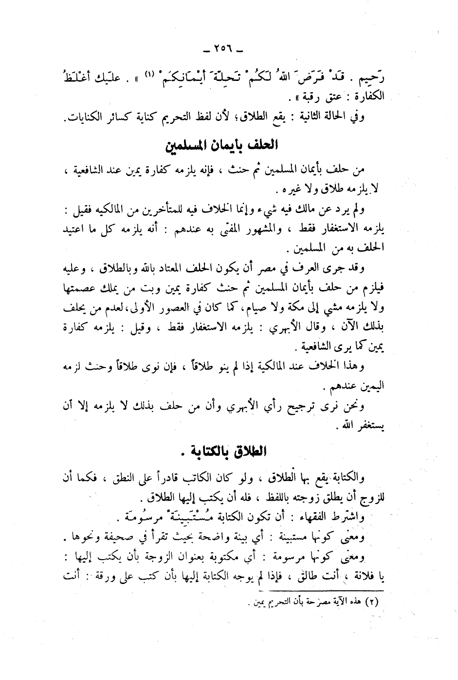 وقد جرى العرف في مصر أن يكون الحلف المعتاد بالله وبالطلاق، وعليه فيلزم من حلف بأيمان المسلمين ثم حنث كفارة يمين وبت من يملك عصمتها ولا يلزمه مشي إلى مكة ولا صيام، كما كان في العصور الاولى، لعدم من يحلف بذلك الآن، وقال الابهري: يلزمه الاستغفار فقط، وقيل: يلزمه كفارة يمين كما يرى الشافعية.