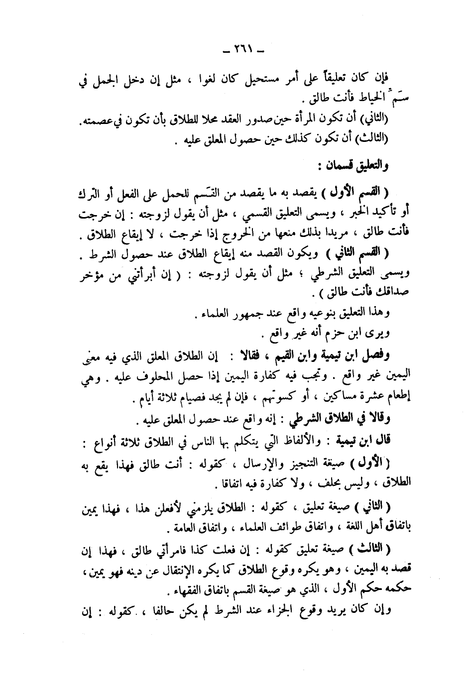 (القسم الاول) يقصد به ما يقصد من القسم للحمل على الفعل أو الترك أو تأكيد الخبر، ويسمى التعليق القسمي، مثل أن يقول لزوجته: إن خرجت فأنت طالق، مريدا بذلك منعها من الخروج إذا خرجت، لا إيقاع الطلاق.