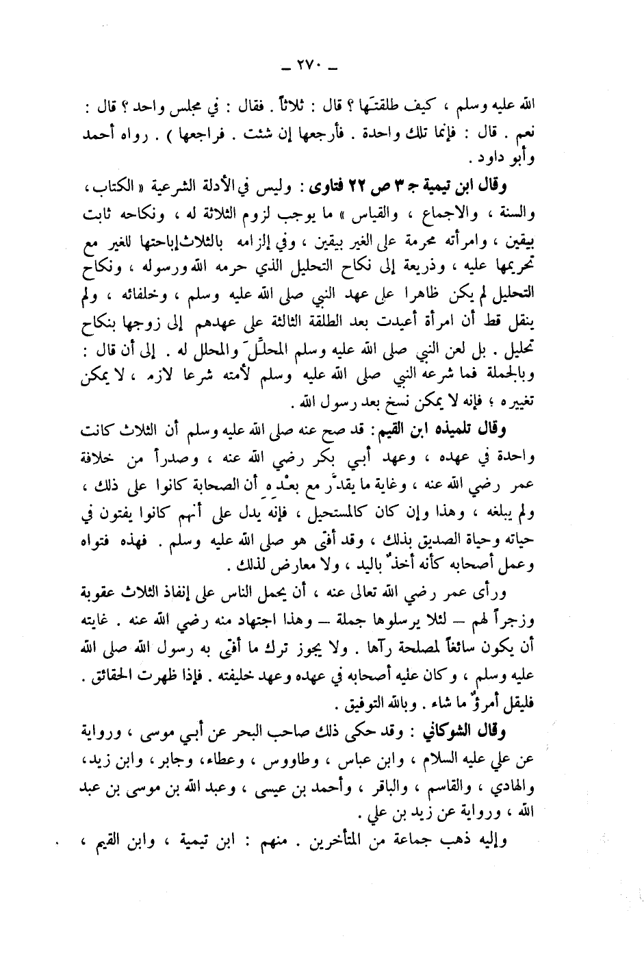 وقال ابن تيمية ج 3 ص 22 فتاوى: وليس في الادلة الشرعية " الكتاب، والسنة، والاجماع، والقياس " ما يوجب لزوم الثلاثة له، ونكاحه ثابت بيقين، وامرأته محرمة على الغير بيقين، وفي إلزامه بالثلاث إباحتها للغير مع تحريمها عليه، وذريعة إلى نكاح التحليل الذي حرمه الله ورسوله، ونكاح التحليل لم يكن ظاهرا على عهد النبي صلى الله عليه وسلم، وخلفائه، ولم ينقل قط أن امرأة أعيدت بعد الطلقة الثالثة على عهدهم إلى زوجها بنكاح تحليل. بل لعن النبي صلى الله عليه وسلم المحلل والمحلل له.