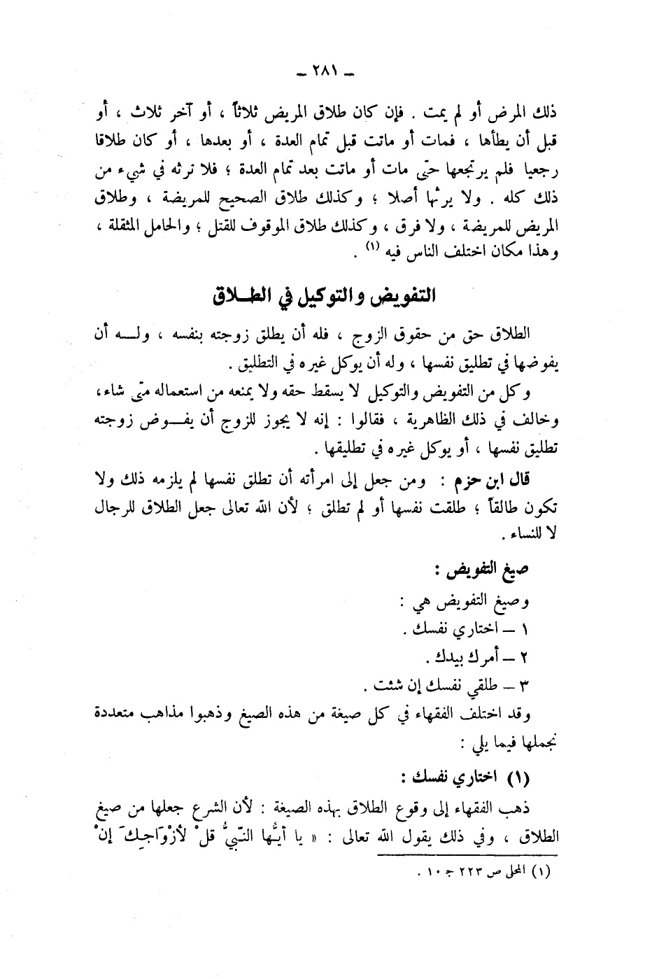 وقد اختلف الفقهاء في كل صيغة من هذه الصيغ وذهبوا مذاهب متعددة نجملها فيما يلي: (1) اختاري نفسك: ذهب الفقهاء إلى وقوع الطلاق بهذه الصيغة: لان الشرع جعلها من صيغ الطلاق، وفي ذلك يقول الله تعالى: " يا أيها النبي قل لازواجك إن