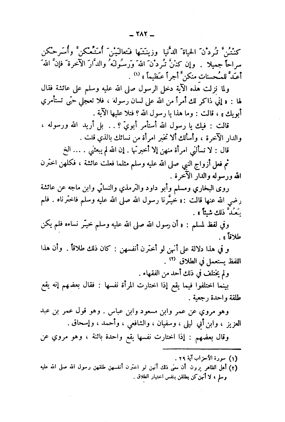 (2) أهل الظاهر يرون أن معنى ذلك أنهن لو اخترن أنفسهن طلقهن رسول الله صلى الله عليه وسلم، لا أنهن كن يطلقن بنفس اختيار الطلاق.