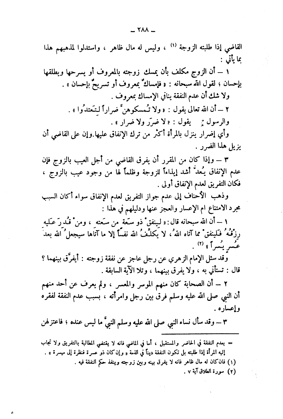 القاضي إذا طلبته الزوجة (1) ، وليس له مال ظاهر، واستدلوا لمذهبهم هذا بما يأتي: 1 - أن الزوج مكلف بأن يمسك زوجته بالمعروف أو يسرحها ويطلقها