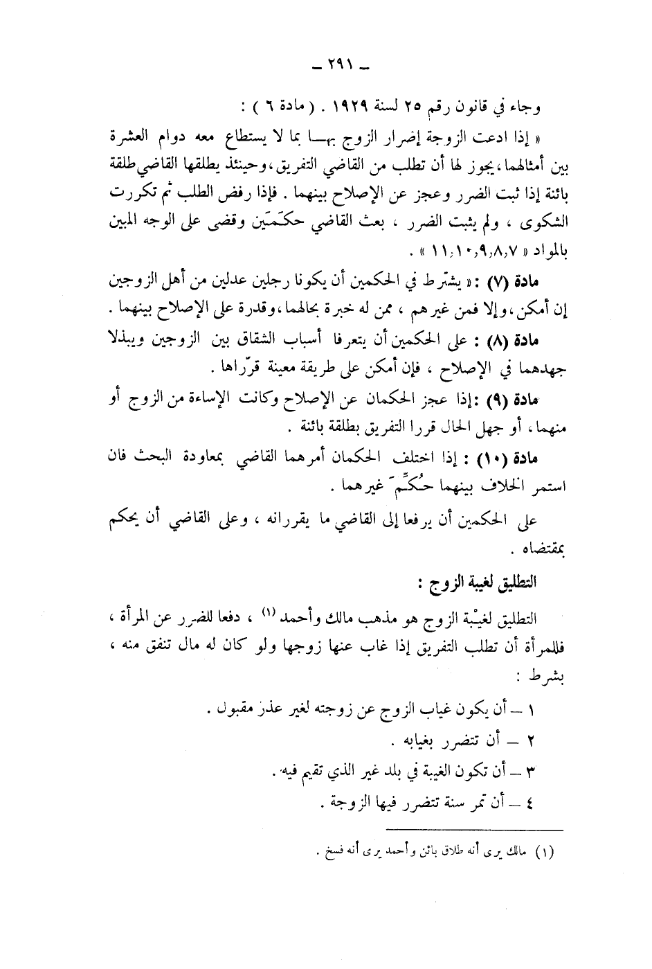 (مادة 6) : " إذا ادعت الزوجة إضرار الزوج بها بما لا يستطاع معه دوام العشرة بين أمثالهما، يجوز لها أن تطلب من القاضي التفريق، وحينئذ يطلقها القاضي طلقة بائنة إذا ثبت الضرر وعجز عن الاصلاح بينهما.