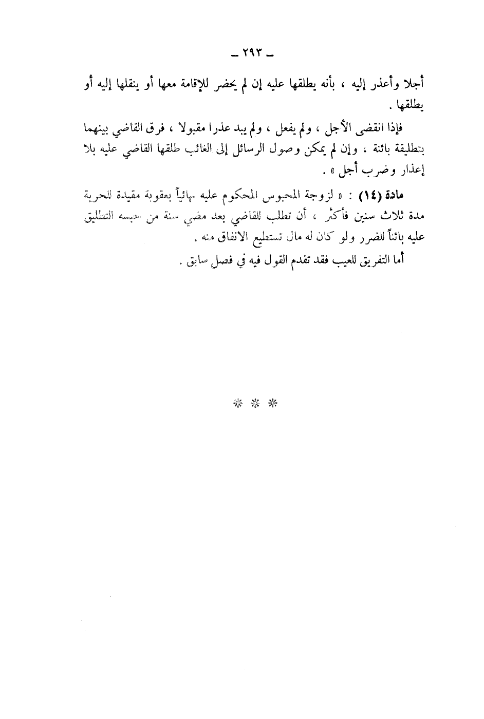 مادة (14) : " لزوجة المحبوس المحكوم عليه نهائيا بعقوبة مقيدة للحرية مدة ثلاث سنين فأكثر، أن تطلب للقاضي بعد مضي سنة من حبسه التطليق عليه بائنا للضرر ولو كان له مال تستطيع الانفاق منه.