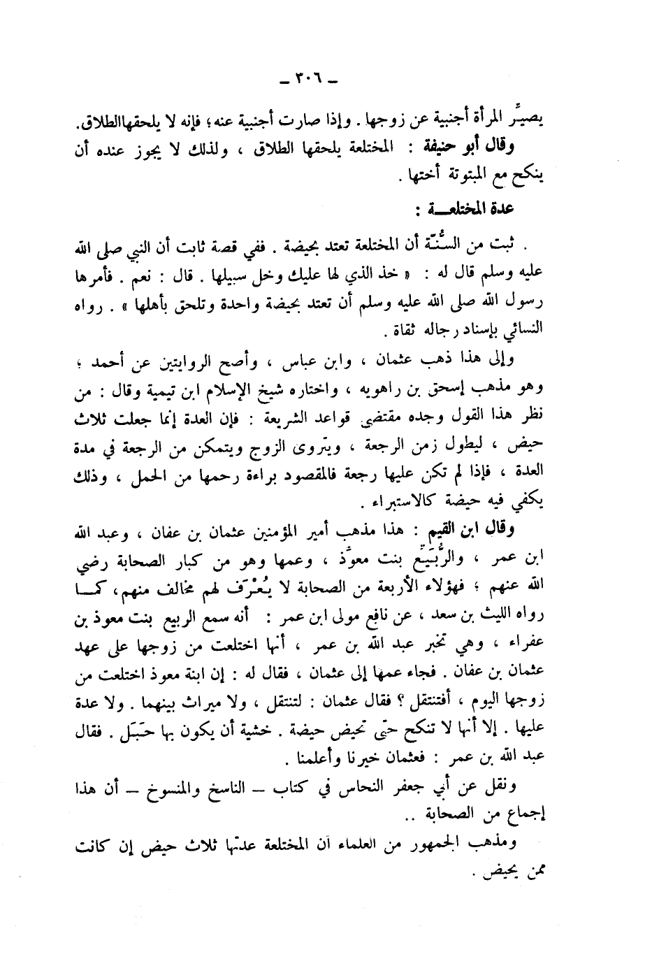 وقال ابن القيم: هذا مذهب أمير المؤمنين عثمان بن عفان، وعبد الله ابن عمر، والربيع بنت معوذ، وعمها وهو من كبار الصحابة رضي الله عنهم، فهؤلاء الاربعة من الصحابة لا يعرف لهم مخالف منهم، كما رواه الليث بن سعد، عن نافع مولى ابن عمر: أنه سمع الربيع بنت معوذ بن عفراء، وهي تخبر عبد الله بن عمر، أنها اختلعت من زوجها على عهد عثمان بن عفان.