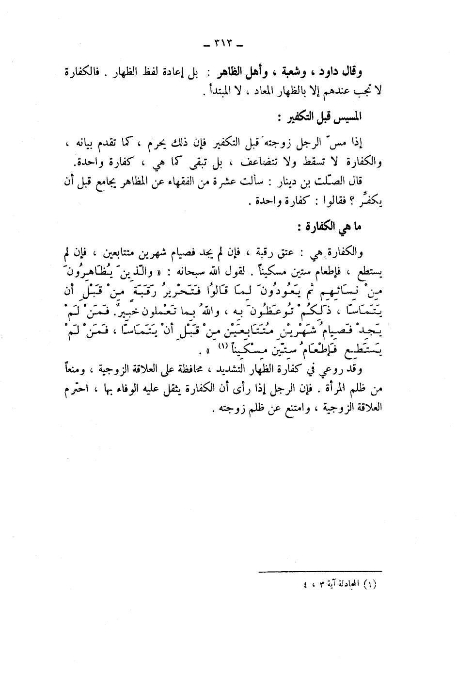 لقول الله سبحانه: " والذين يظاهرون من نسائهم ثم يعودون لما قالوا فتحرير رقبة من قبل أن يتماسا، ذلكم توعظون به، والله بما تعملون خبير. فمن لم يجد فصيام شهرين متتابعين من قبل أن يتماسا، فمن لم يستطع فإطعام ستين مسكينا (1) ".