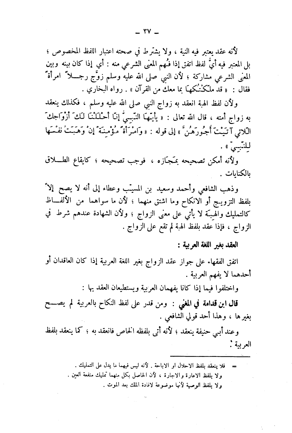 ولان لفظ الهبة انعقد به زواج النبي صلى الله عليه وسلم، فكذلك ينعقد به زواج أمته، قال الله تعالى: (يأيها النبي إنا أح للنا لك أزواجك اللاتي آتيت أجورهن) إلى قوله: (وامرأة مؤمنة إن وهبت نفسها للنبي) .
