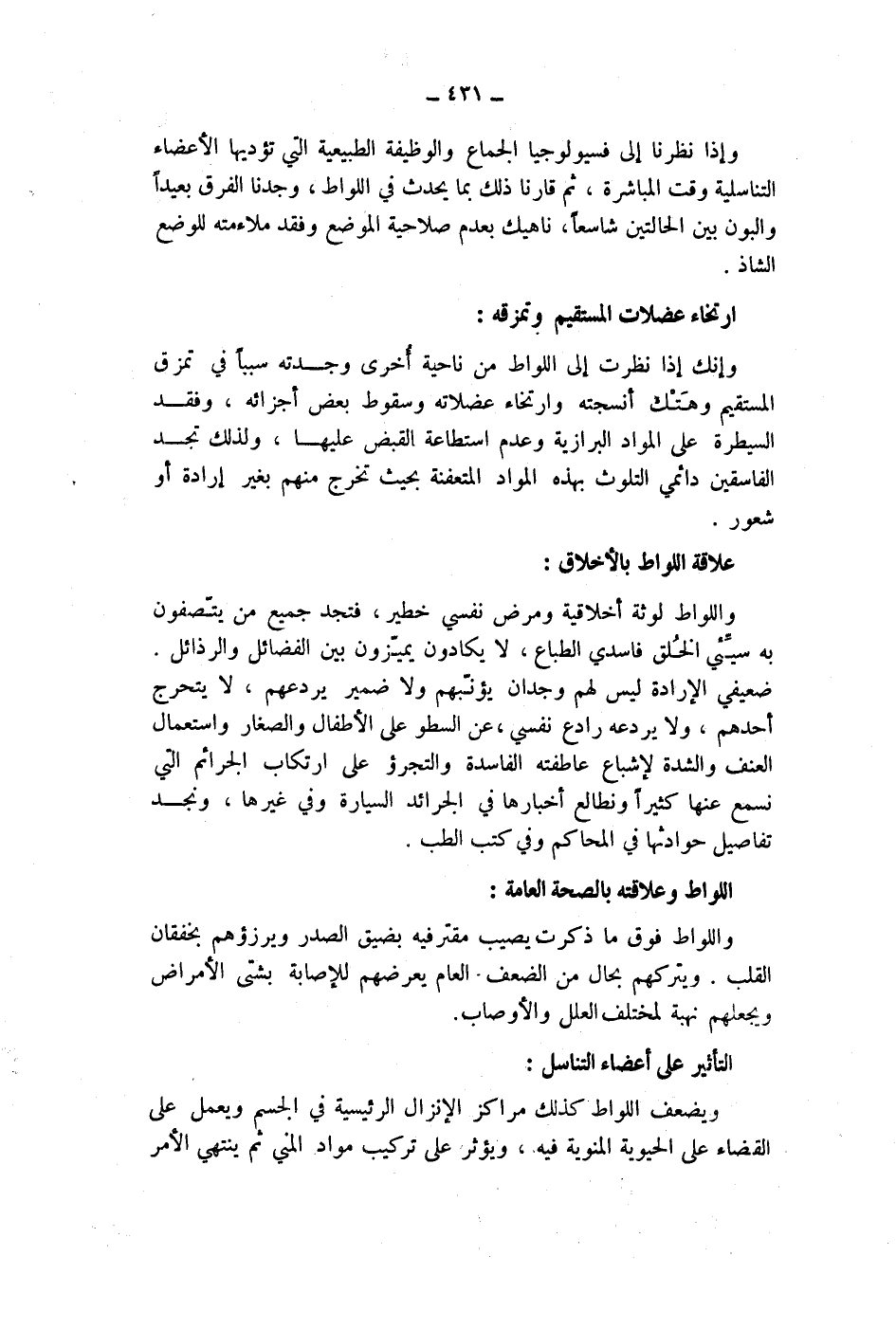ارتخاء عضلات المستقيم وتمزقه: وإنك إذا نظرت إلى اللواط من ناحية أخرى وجدته سببا في تمزق المستقيم وهتك أنسجته وارتخاء عضلاته وسقوط بعض أجزائه، وفقد السيطرة على المواد البرازية وعدم استطاعة القبض عليها، ولذلك تجد الفاسقين دائمي التلوث بهذه المواد المتعفنة بحيث تخرج منهم بغير إرادة أو شعور.