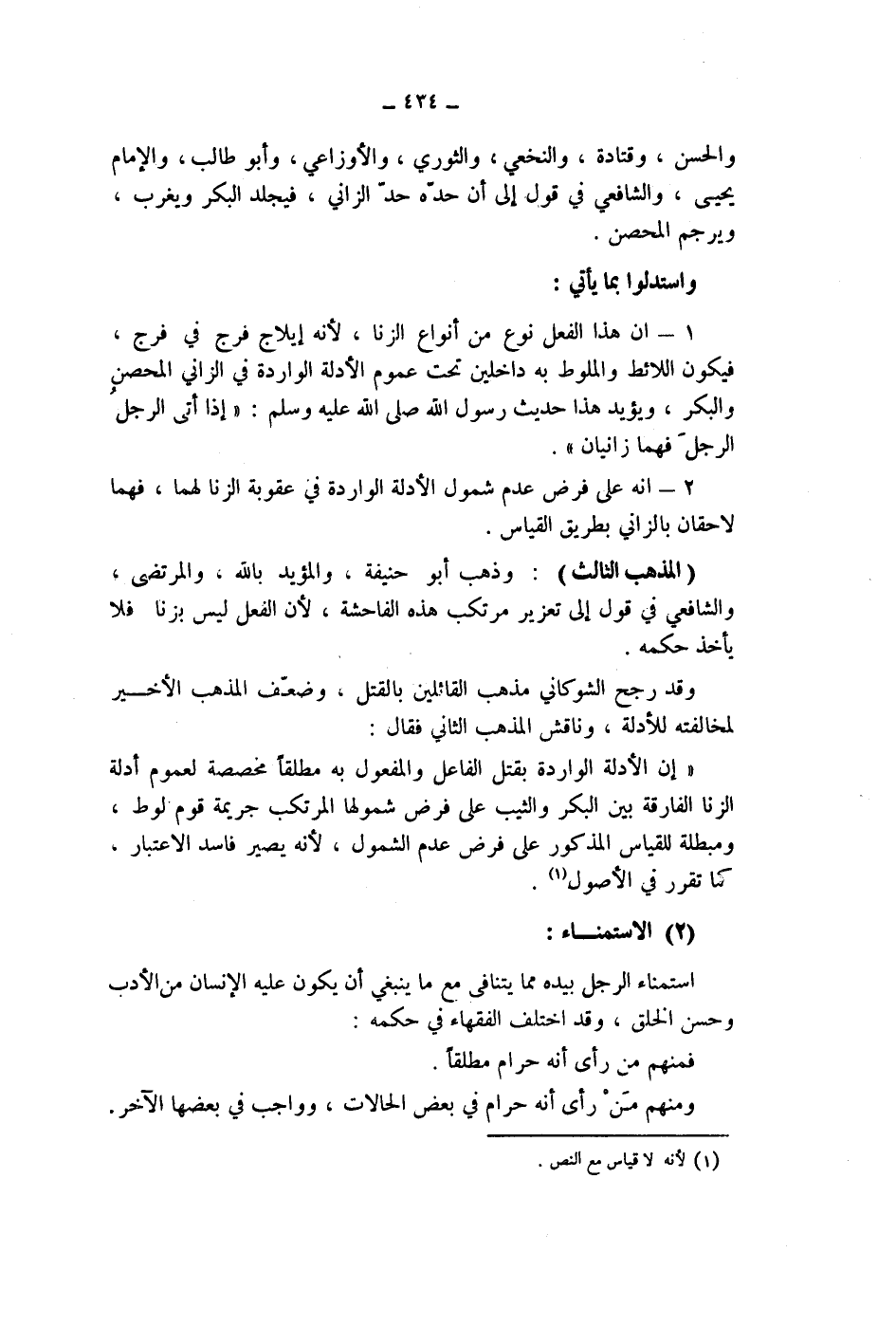 وقد رجح الشوكاني مذهب القائلين بالقتل، وضعف المذهب الاخير لمخالفته للادلة، وناقش المذهب الثاني فقال: " إن الادلة الواردة بقتل الفاعل والمفعول به مطلقا مخصصة لعموم أدلة الزنا الفارقة بين البكر والثيب على فرض شمولها المرتكب جريمة قوم لوط، ومبطلة للقياس المذكور على فرض عدم الشمول، لانه يصير فاسد الاعتبار، كما تقرر في الاصول (1) .