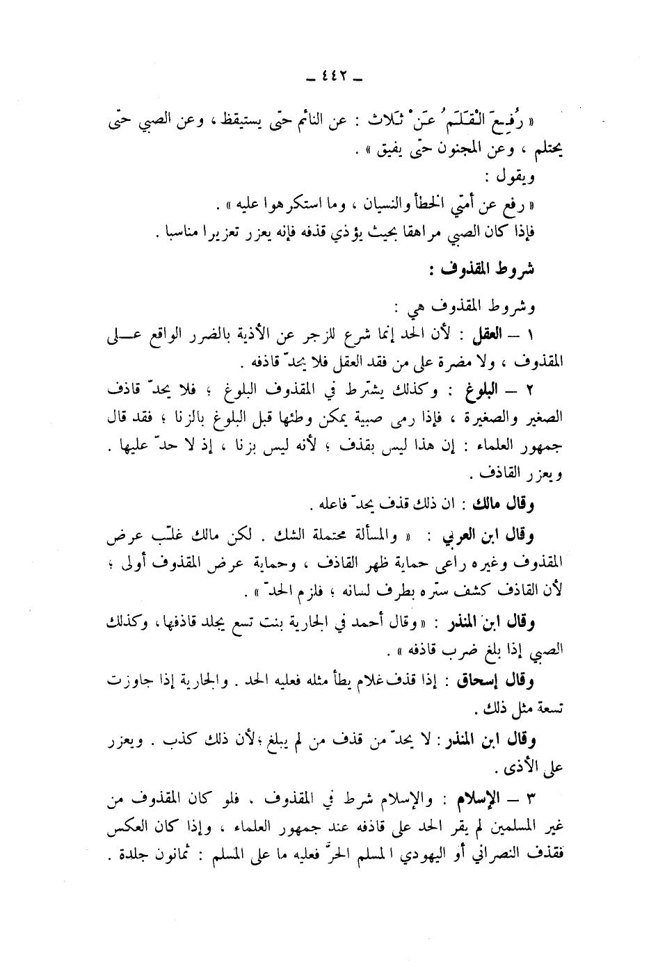 3 - الاسلام: والاسلام شرط في المقذوف، فلو كان المقذوف من غير المسلمين لم يقر الحد على قاذفه عند جمهور العلماء، وإذا كان العكس فقذف النصراني أو اليهودي المسلم الحر فعليه ما على المسلم: ثمانون جلدة.