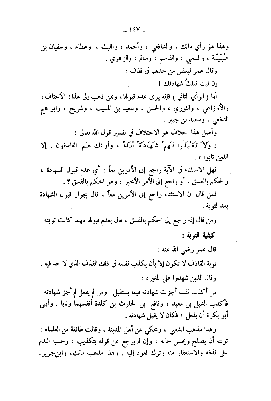 قال عمر رضي الله عنه: توبة القاذف لا تكون إلا بأن يكذب نفسه في ذلك القذف الذي لا حد فيه.