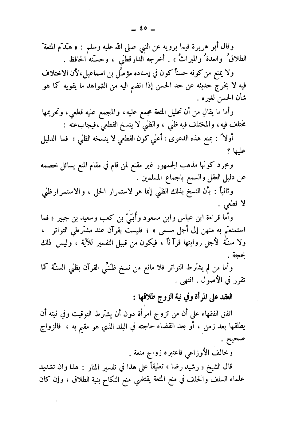 قال الشيخ (رشيد رضا) تعلقا على هذا في تفسير المنار: هذا وان تشديد علماء السلف والخلف في منع المتعة يقتضي مع النكاح بنية الطلاق، وإن كان
