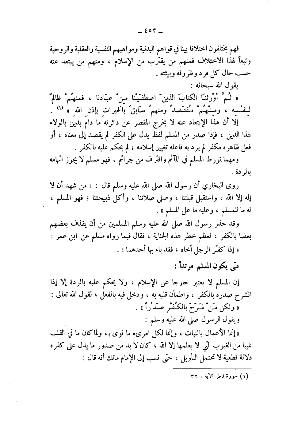 يقول الله سبحانه: " ثم أورثنا الكتاب الذين اصطفينا من عبادنا، فمنهم ظالم لنفسه، ومنهم مقتصد ومنهم سابق بالخيرات بإذن الله " (1) ، إلا أن هذا الابتعاد عنه لا يخرج المقصر عن دائرته ما دام يدين بالولاء لهذا الدين، فإذا صدر من المسلم لفظ يدل على الكفر لم يقصد إلى معناه، أو فعل ظاهره مكفر لم يرد به فاعله تغيير إسلامه، لم يحكم عليه بالكفر.