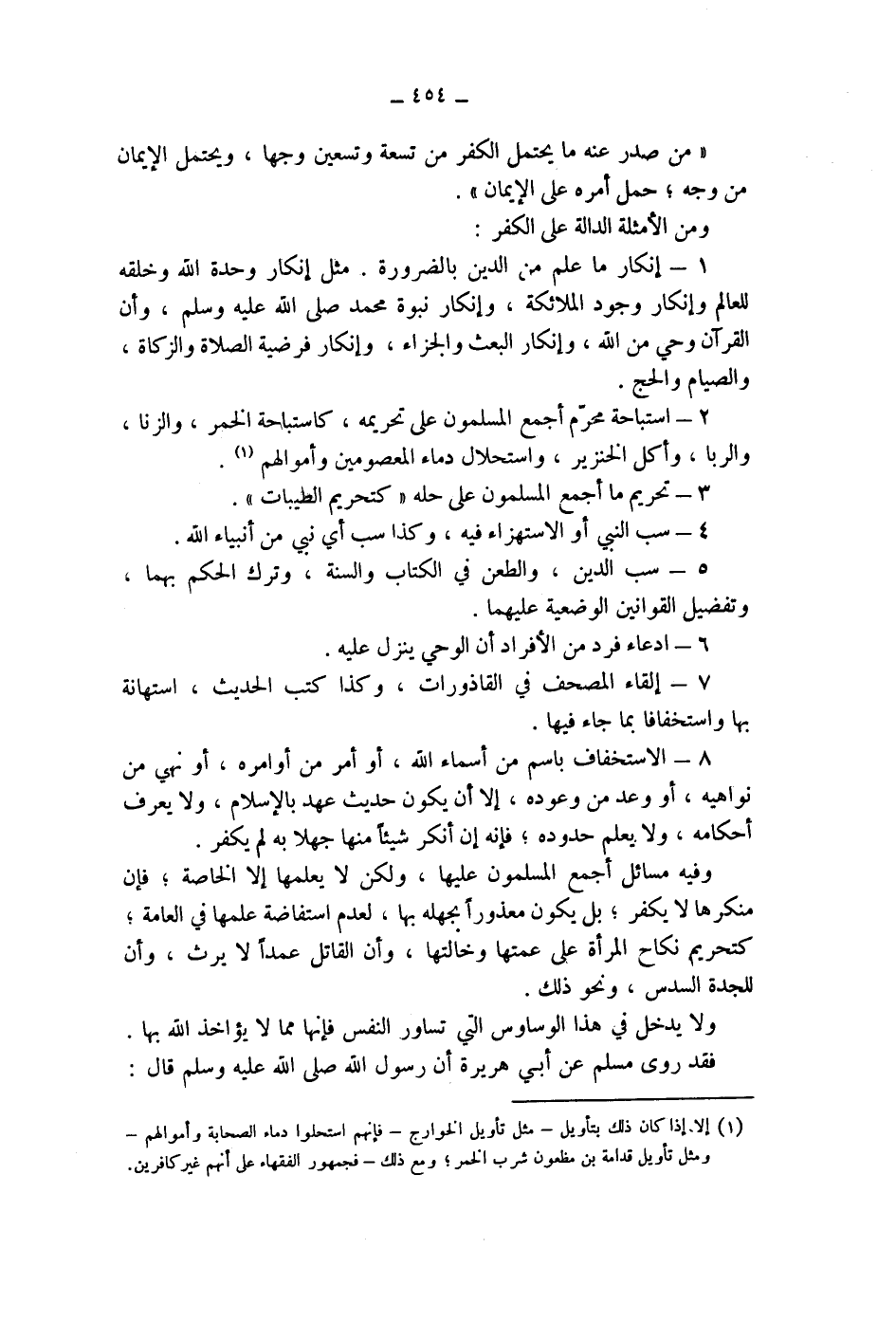 (1) إلا إذا كان ذلك بتأويل - مثل تأويل الخوارج - فإنهم استحلوا دماء الصحابة وأموالهم - ومثل تأويل قدامة بن مظعون شرب الخمر، ومع ذلك - فجمهور الفقهاء على أنهم غير كافرين.