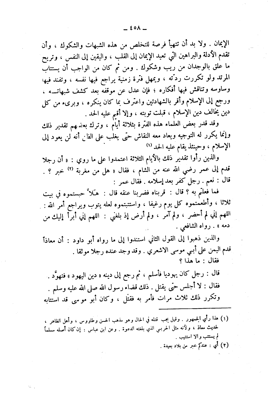 وقد قدر بعض العلماء هذه الفترة بثلاثة أيام، وترك بعضهم تقدير ذلك وإنما يكرر له التوجيه ويعاد معه النقاش حتى يغلب على الظن أنه لن يعود إلى الاسلام، وحينئذ يقام عليه الحد (1) والذين رأوا تقدير ذلك بالايام الثلاثة اعتمدوا على ما روي: " أن رجلا قدم إلى عمر رضي الله عنه من الشام، فقال " هل من مغربة (2) خبر ".