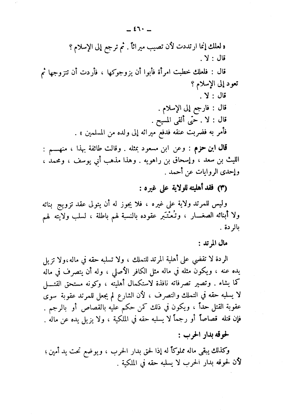 وتصير تصرفاته نافذة لاستكمال أهليته، وكونه مستحق القتل لا يسلبه حقه في التملك والتصرف، لان الشارع لم يجعل للمرتد عقوبة سوى عقوبة القتل حدا، ويكون في ذلك كمن حكم عليه بالقصاص أو بالرجم.