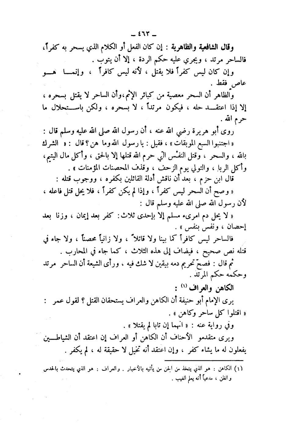 ويرى متقدم والاحناف أن الكاهن أو العراف إن اعتقد أن الشياطين يفعلون له ما يشاء كفر.