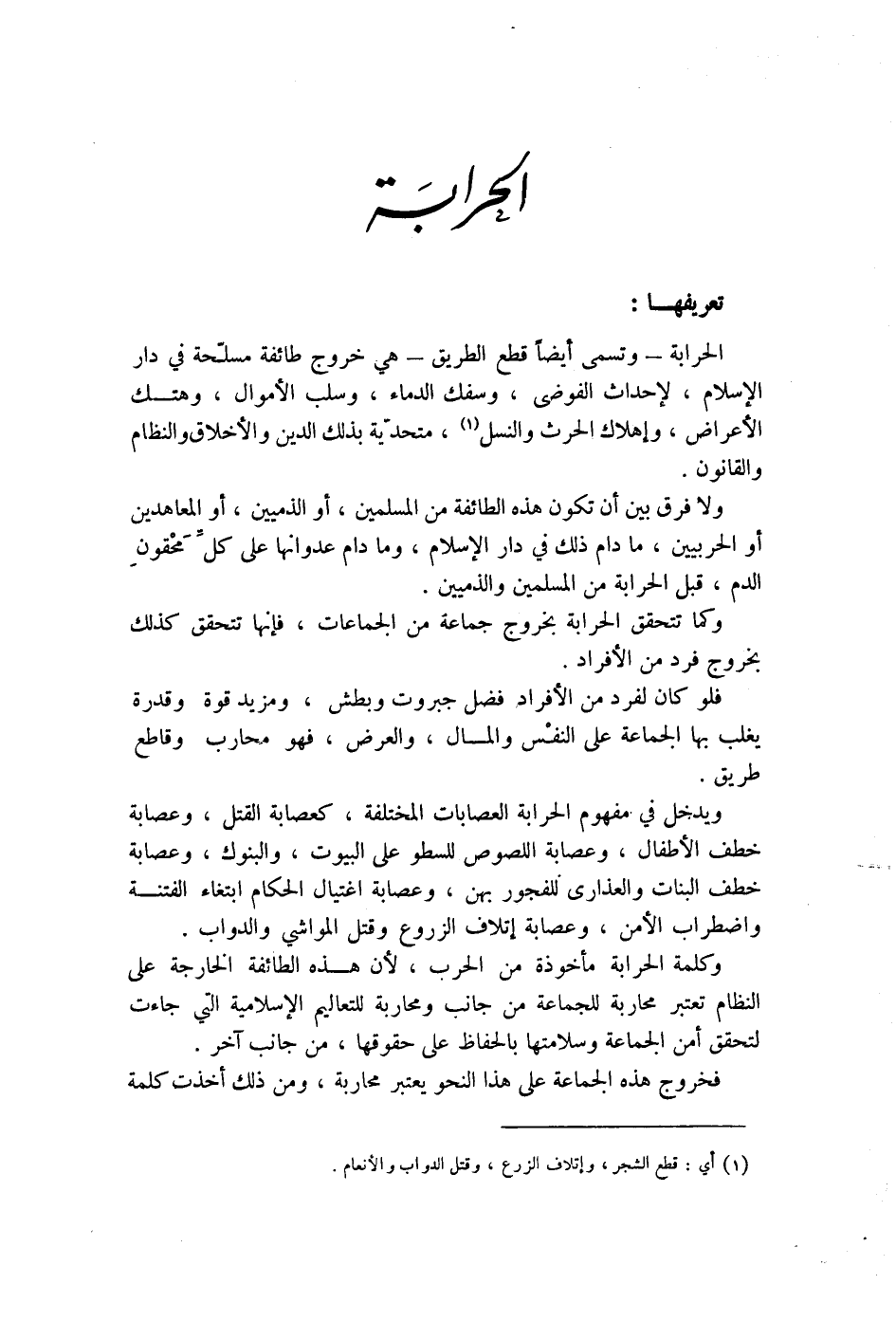 تعريفها: الحرابة - وتسمى أيضا قطع الطريق - هي خروج طائفة مسلحة في دار الاسلام، لاحداث الفوضى، وسفك الدماء، وسلب الاموال، وهتك الاعراض، وإهلاك الحرث والنسل (1) ، متحدية بذلك الدين والاخلاق والنظام والقانون.