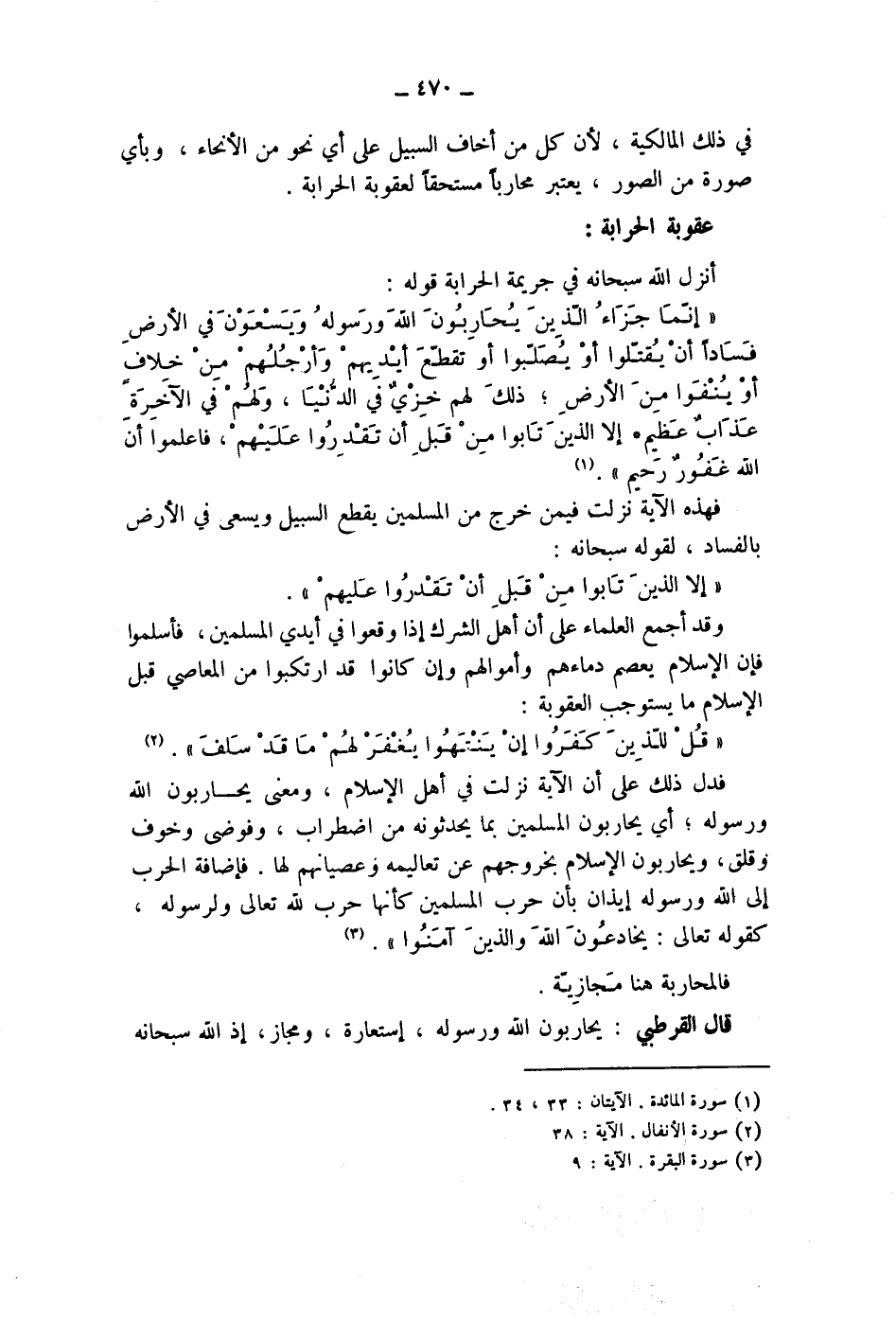 (2) فدل ذلك على أن الاية نزلت في أهل الاسلام، ومعنى يحاربون الله ورسوله، أي يحاربون المسلمين بما يحدثونه من اضطراب، وفوضى وخوف وقلق، ويحاربون الاسلام بخروجهم عن تعاليمه وعصيانهم لها.