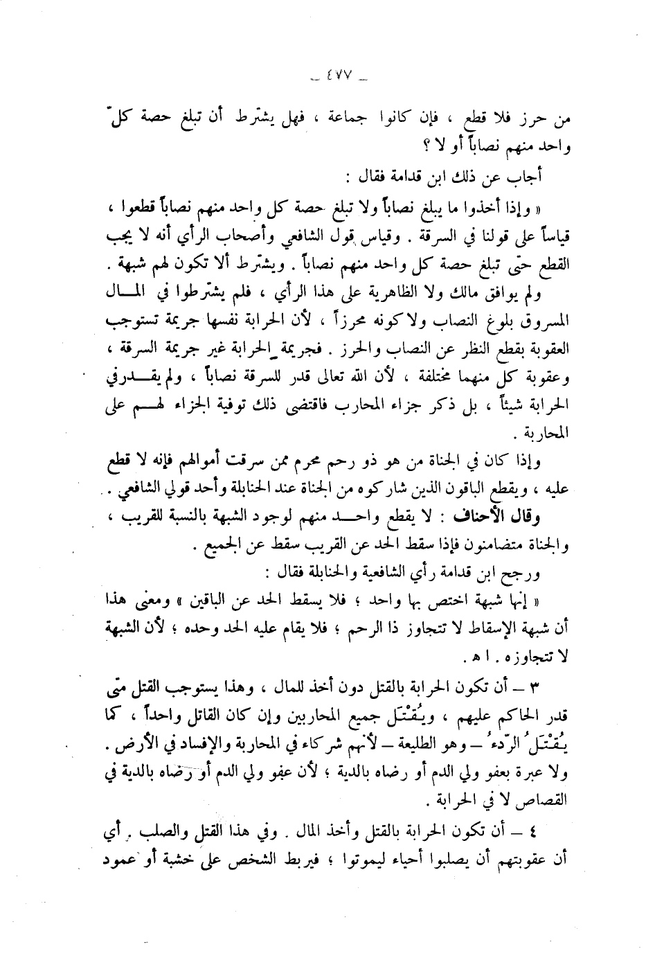 ولم يوافق مالك ولا الظاهرية على هذا الرأي، فلم يشترطوا في المال المسروق بلوغ النصاب ولا كونه محرزا، لان الحرابة نفسها جريمة تستوجب العقوبة بقطع النظر عن النصاب والحرز.