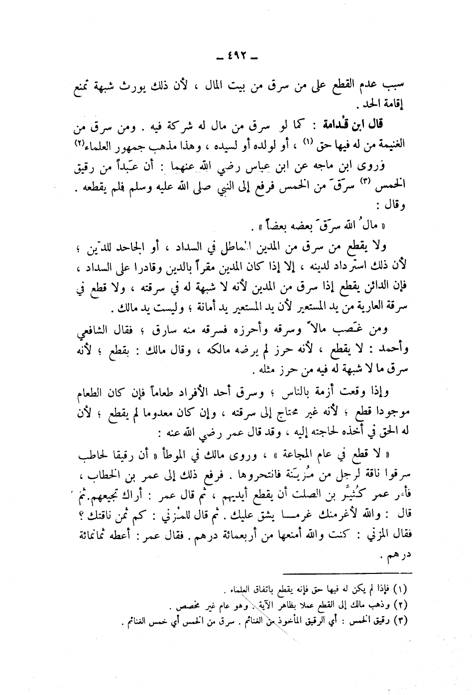 ومن سرق من الغنيمة من له فيها حق (1) ، أو لولده أو لسيده، وهذا مذهب جمهور العلماء (2) وروى ابن ماجه عن ابن عباس رضي الله عنهما: أن عبدا من رقيق الخمس (3) سرق من الخمس فرفع إلى النبي صلى الله عليه وسلم فلم يقطعه.